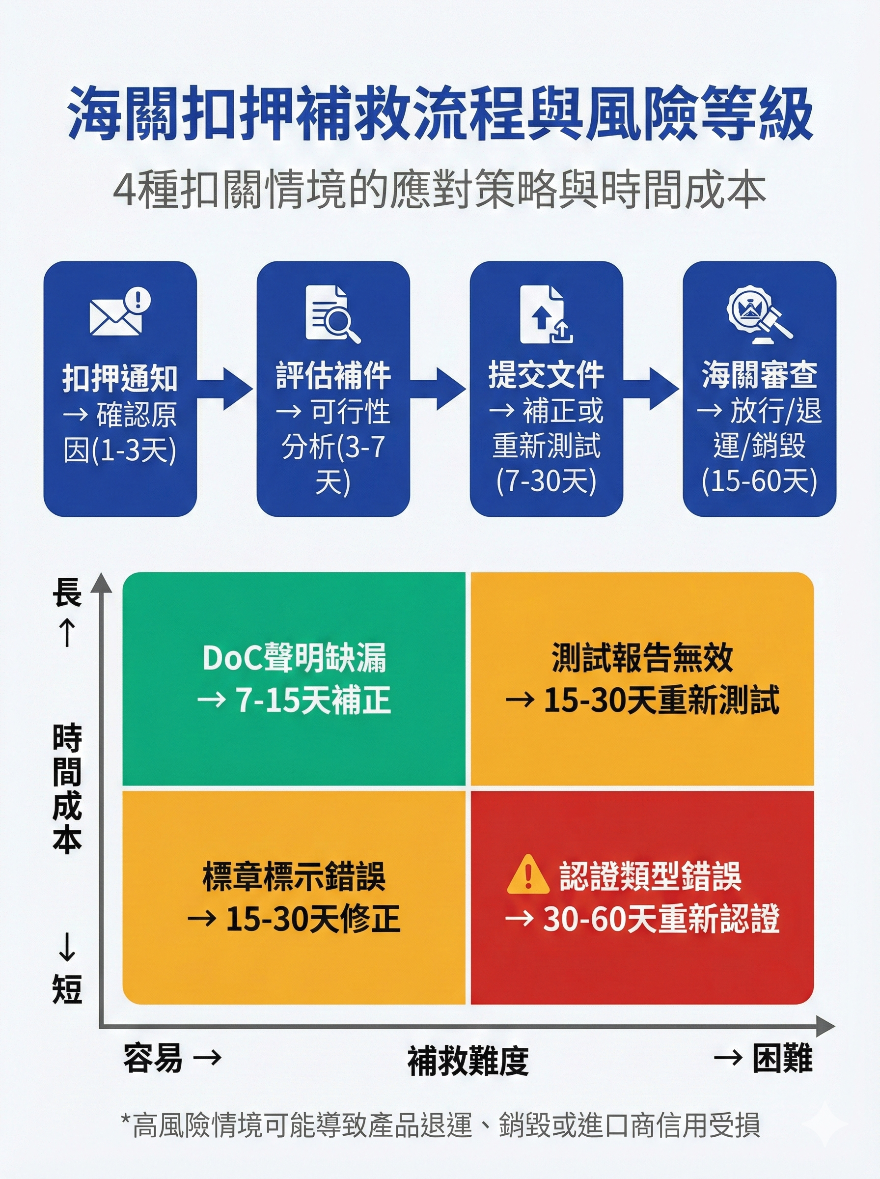 此圖表整理海關扣押後的補救流程與各情境的風險等級,幫助製造商快速判斷應對策略與時間成本。